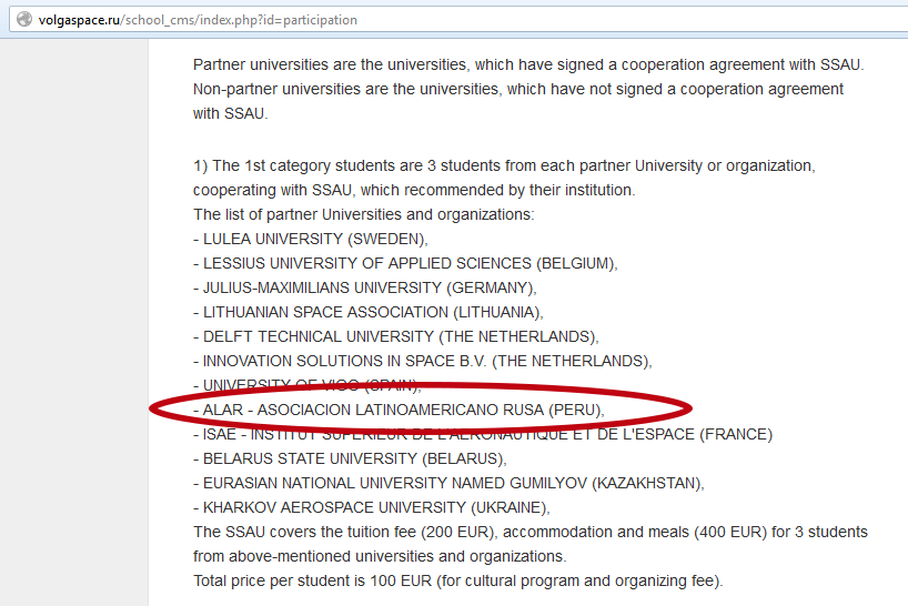 Gracias a la labor realizada de Cooperación Internacional en el campo Aeroespacial, los Organizadores de la «International Summer Space School» designaron a ALAR – Asociación Latinoamericano Rusa, como «Partner Organization» de este importante evento científico que se realiza anualmente. La categoría de Partner Organization le brinda a ALAR la posibilidad de profundizar la cooperación en el campo Aeroespacial entre entidades científico-académicas de Latinoamérica con Rusia pero también le constituye en la entidad encargada de la difusión y registro de participantes a este importante evento.