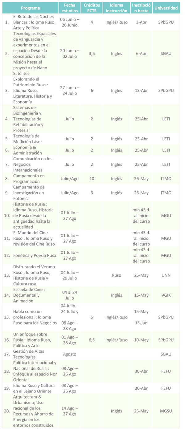 Gracias por su interés. Puede ver las descripciones de los cursos de verano, los requisitos de las becas y procedimiento de inscripción aquí: http://www.universidades-rusia.com/index.php/es/2013-01-09-19-32-08/cursos-de-verano-en-rusia