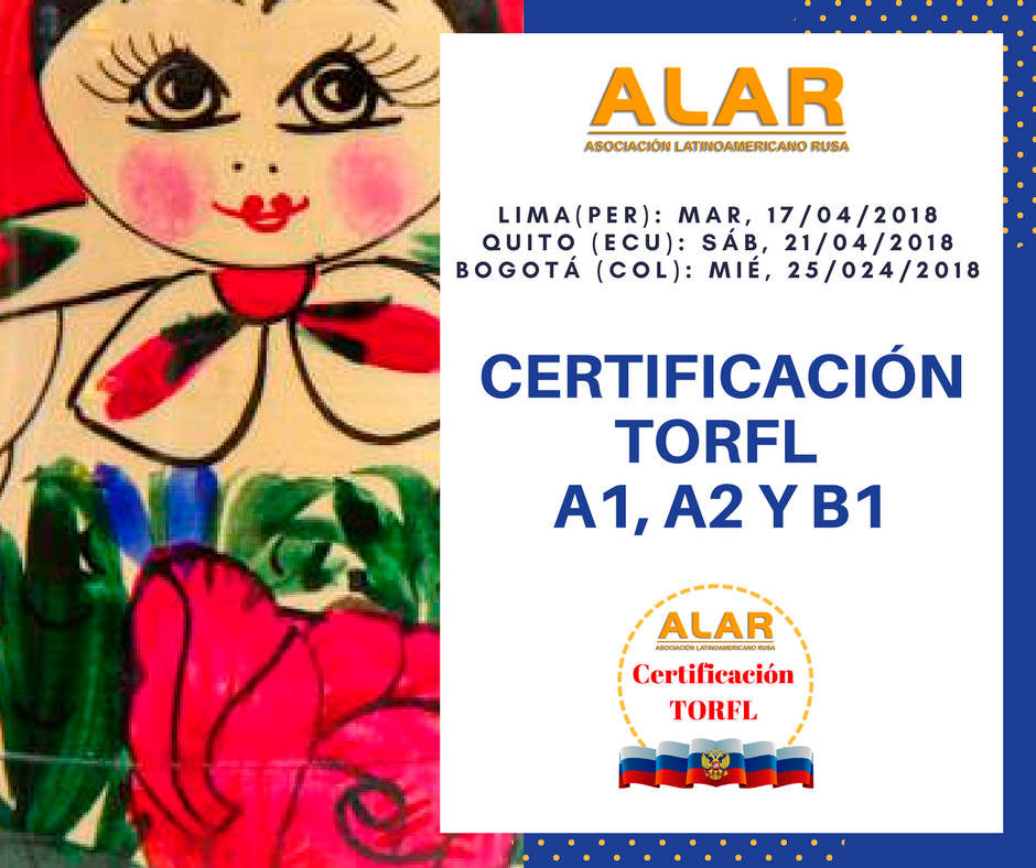 Estaremos certificando idioma ruso en los niveles de A1, A2 y B1 en las siguientes fechas: día martes 17 de abril en Lima (Centro de Ciencia y Cultura Rusa), el día sábado 21 de abril en Quito (Sede de la UTE) y el 25 de abril en Bogotá (Instituto Cultural León Tolstoi). Estas certificaciones se realizan en conjunto con la Universidad Rusa Amistad de los Pueblos, sólo en estas fechas y para acceder a ellas debes revisar los requisitos en www.idiomaruso.org
