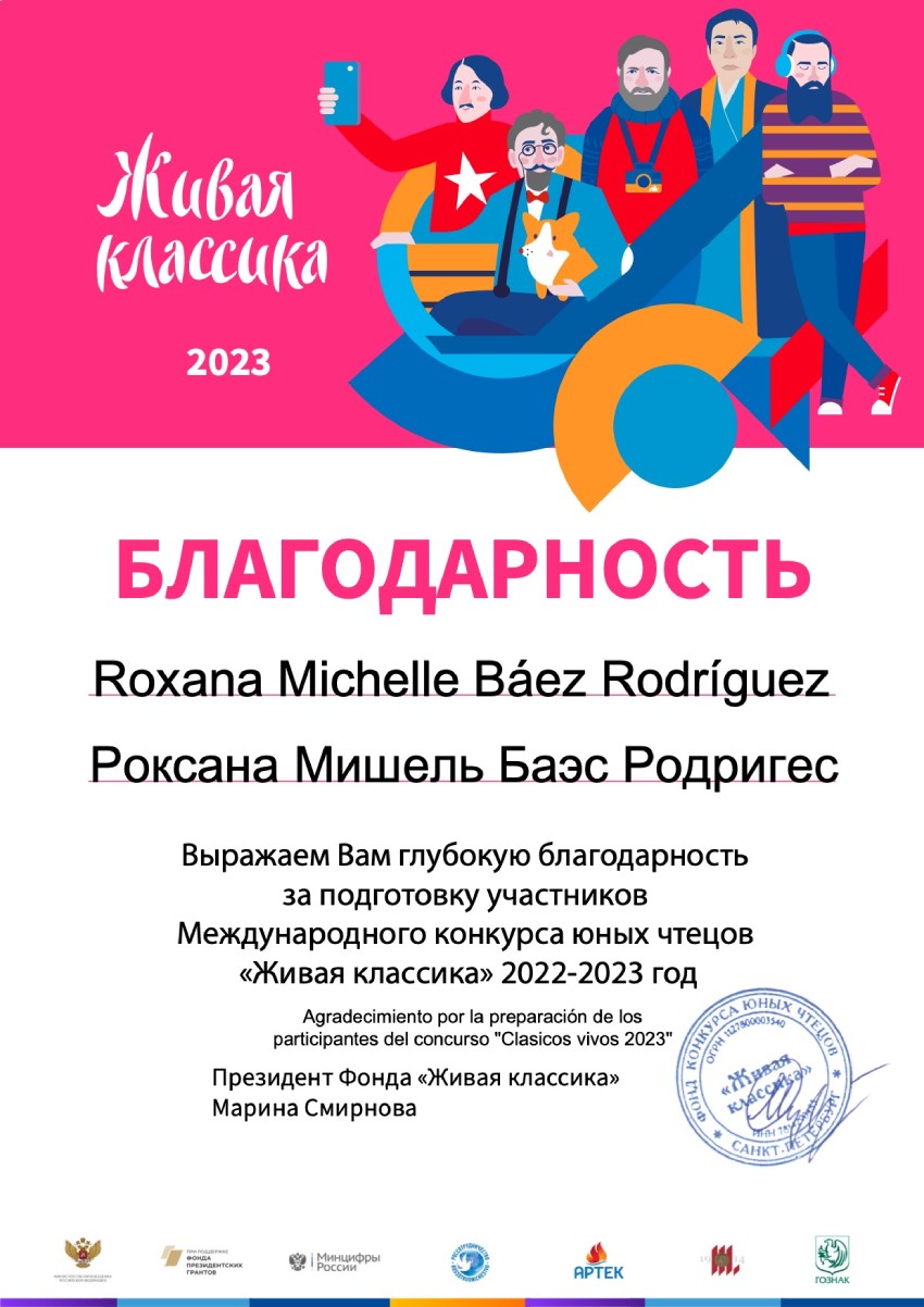 Gracias a ALAR he tenido la oportunidad de ser maestra de ruso básico para los estudiantes de secundaria especialmente los estudiantes de entre 16 a 17 años. Varios estudiantes de Puerto Rico han podido estudiar el idioma, por primera vez en la historia estos jóvenes puertorriqueños claramente representando a Puerto Rico han podido participar en concursos de lectura de alta reputación como es “Zhivaya Klassika”. También han logrado la cultura las tradiciones, todo esto aprendiendo solamente el idioma ruso. Han podido conocer Rusia su tradición.